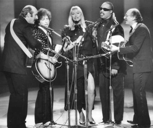 Stars perform during the "All Star Celebration Honouring Martin Luther King Jr." at the Kennedy Centre, in Washington D.C., on Jan. 20, 1986. From left to right; Paul Stookey, Bob Dylan, Mary Travers, Stevie Wonder and Peter Yarrow. Associated Press