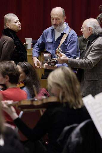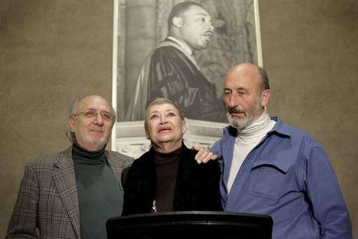 Mary Travers, left, Noel Stookey, center, and Peter Yarrow of the legendary folk trio Peter, Paul and Mary, rehearse at the Riverside Church in New York, Thursday, Dec. 8, 2005. Associated Press