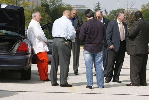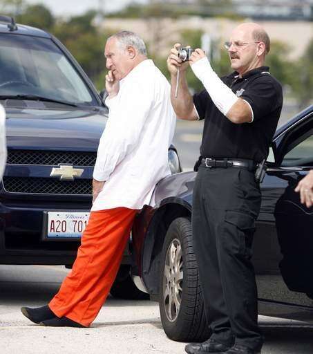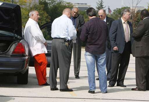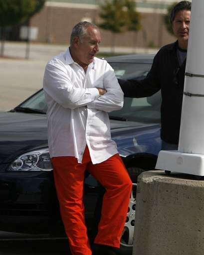 A detective wearing orange prisoner pants and no shoes speaks with Rolling Meadows police and detectives in the northwest parking lot of Meijer parking lot on Golf Road.