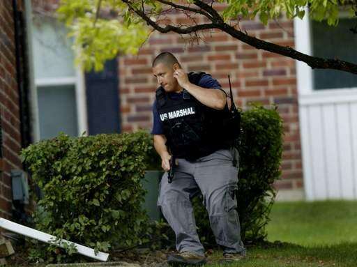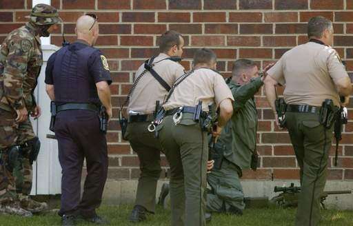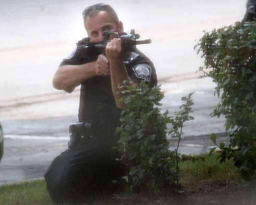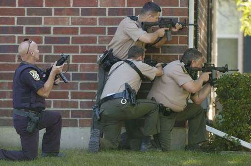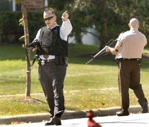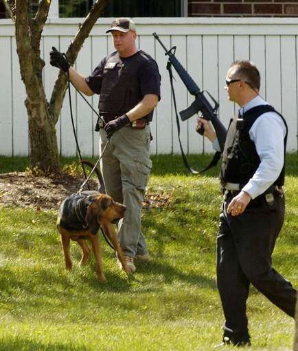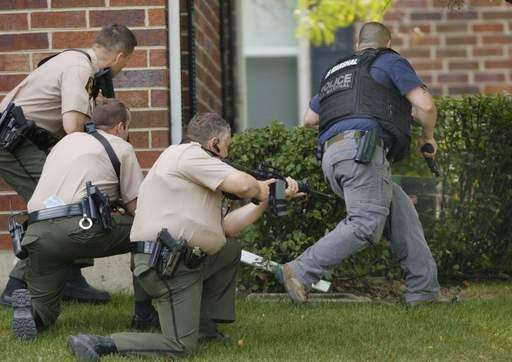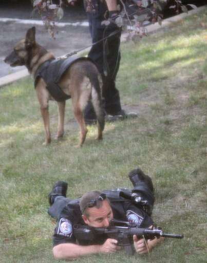 A Rolling Meadows police officer trains his gun on an apartment where police suspected escaped criminal Robert Maday was hiding after escaping police custody in Arlington Heights.