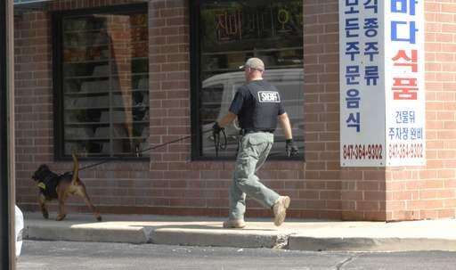 A tactical officer walks through the parking lot at Wellington Restaurant in Arlington Heights.