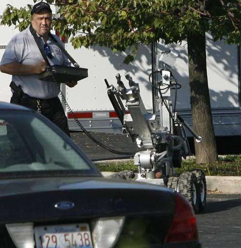A police robot was taken out of a command vehicle and operated for several minutes before being remotely driven back into the police vehicle in the parking lot of the Wellington Restaurant of Arlington Heights.