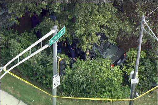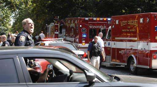 Robert Maday is surrounded by police and fire officials after crashing his car Friday in West Chicago.