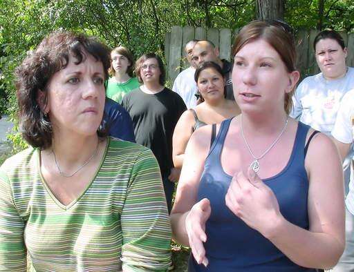 Michelle Lorman, left, and Nicole Bratko, right, both of West Chicago, describe the capture of escapee Robert Mayday today in West Chicago.