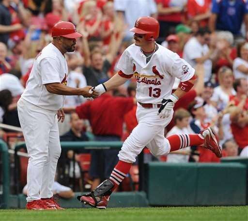 Brendan Ryan is congratulated by third base coach Jose Oquendo after his home run against in the fifth inning. Associated Press