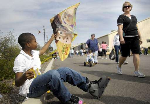 Wally Williams, 13, of Chicago gets ready to take his brand new kite on its first flight at the St. Peter's Barn Sale inside the Kane County Fairgrounds in St. Charles on Saturday.