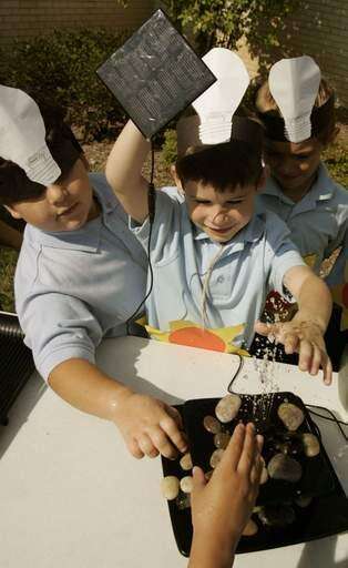 St. Philip the Apostle kindergartner Christopher Baran, center, used a solar electric panel to power the water fountain Tuesday outside the school in Addison, as Gianfranco Pischetola, left, looks on.