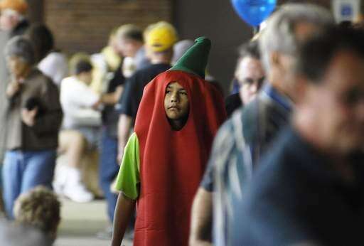 Alex Calderon, 13, wears a pepper costume as he walks through the crowd Sunday at the Taste on the Plaza in St. Charles. His family owns and operates The Jalapeno Grill. north of Main Street at the river.