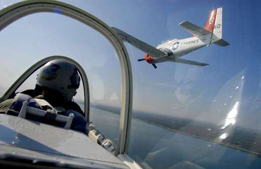 Two T-28 Trojan airplanes streak across the skies over Lake County Monday in advance of this weekend's ninth-annual Waukegan Regional Air Show.