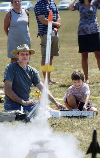 Kids in the Space Campers program at the Wheaton Sport Center Space Camp built model rockets this week and got to blast them off in Carol Stream. Space Camper Griff Ahnert, right, pushes the launch button on his rocket.