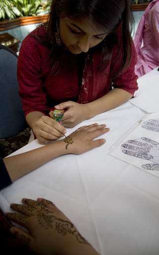 Falak Anwar applies henna to a girl's hands as a decoration for the end of Ramadan at the Eid shopping bazaar on Saturday.