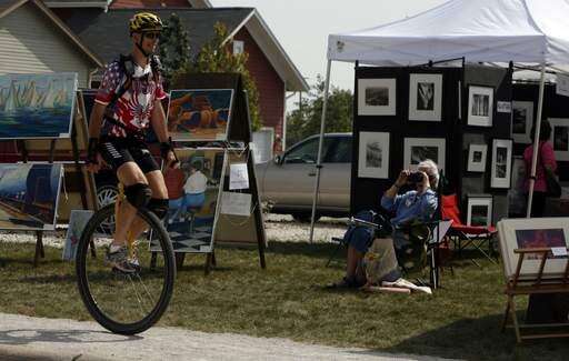 Bruce Williams of Lake Villa rides his unicycle past the Prairie Crossing Fine Arts Festival as an artist takes his picture on Saturday at the Shops at Station Square in Grayslake.