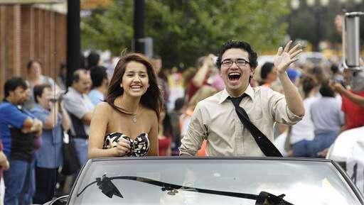 Homecoming Court representatives Gladys Martinez and George Portillo laugh it up during the Elgin High School Homecoming parade Sunday through downtown Elgin.