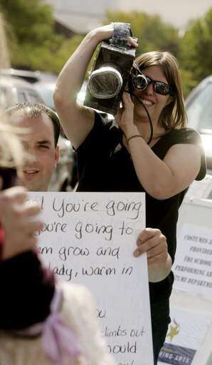 Volunteer, Katherine Hart, right, of Naperville filming "Titanic" movie during Family Day at the Naperville Independent Film Festival at Holiday Inn Select Sunday in Naperville.