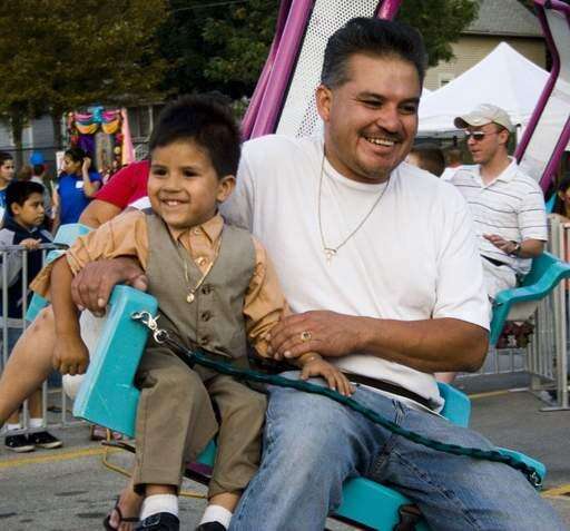Manuel Luna and his son, Brian, 2, enjoy an amusement ride at the Fiesta de Luces hosted by the city of Aurora to celebrate Hispanic Heritage Month on Saturday.