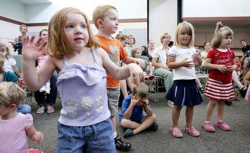 Josephine Larson, 2, of Lindenhurst, flaps her arms to a song by award-winning musician Susan Salidor Tuesday as she entertained children at Lake Villa District Library.