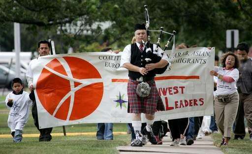 Willie Newcomb Jr. plays the bagpipes as he leads a group of walkers along Goebbert Rd. during the Diversity Walk and Festival Sunday at Forest View Educational Center in Arlington Heights.