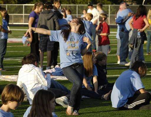 "Stomp the Stigma" supporter Natalie Kahn,15, dances inside the stadium after she marched down Main Street in Barrington en route to Barrington High for a rally sponsored by a communitywide mental health task force. Mark Welsh | Staff Photographer