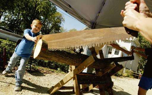 Kyle Drexler, of Glen Ellyn try out log sawing old fashion way Sunday with his mom Lisa during Glen Ellyn Historical Society sponsors its annual Tavern Day celebration at Stacy's Tavern Museum in Glen Ellyn. Tanit Jarusan | Staff Photographer
