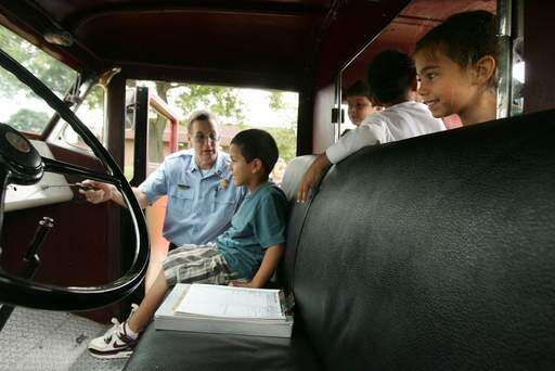 Libertyville firefighter John Rasmussen shows Ethan Hernandez how to operate the horn as the Libertyville Fire Department gives rides Wednesday on a 1946 American LaFrance fire truck at Butterfield School in Libertyville. Gilbert R. Boucher II | Staff Photographer