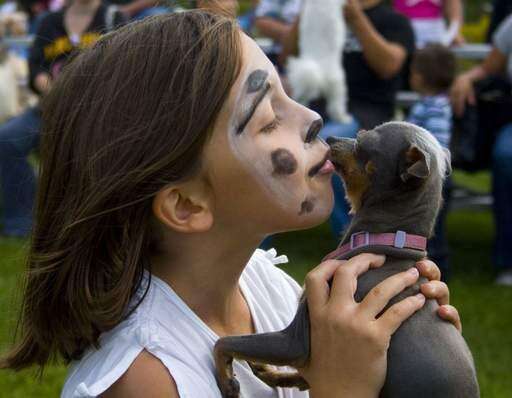 Faith Magnus, 6, and her pup Puff kiss during a longest dog kiss contest at the Carol Stream Barks dog celebration at Armstrong Park on Saturday. Stephanie Janisch | Staff Photographer