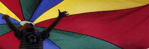 2-year-old Justin Bobeczko of Geneva relishes his moment under the parachute during the Tiny Toddler 2's tumbling and gymnastics class at the Sunset Community Center in Geneva Monday. Rick West | Staff Photographer
