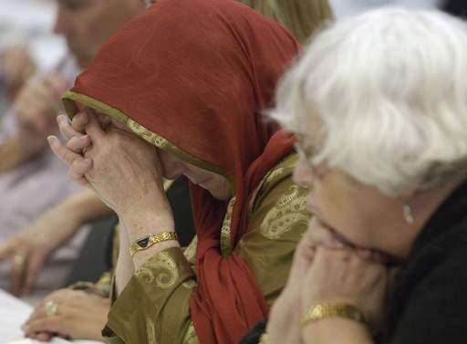 Barbara Adrianopoli, left, bows her head during the recitation of the Holy Quran during an Iftar gathering at the Masjid A-Huda mosque Thursday in Schaumburg. Joe Lewnard | Staff Photographer
