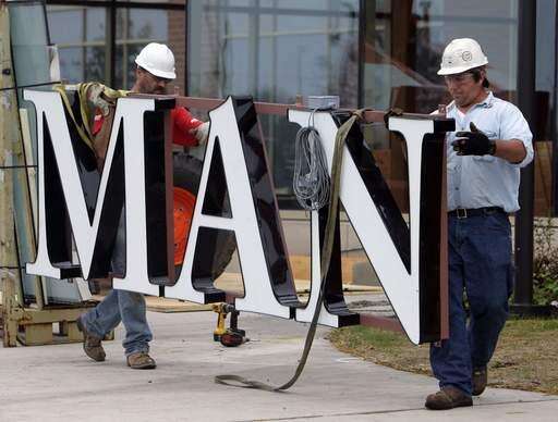 Bill Leahy, right, and an unidentified worker prepare a portion of the sign that will be installed on the new Sherman Hospital in Elgin Tuesday. Brian Hill | Staff Photographer