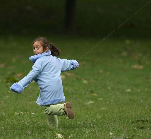 Samantha Elizalde, 5 of Elgin streaks through Lords Park Monday afternoon in hopes of getting her kite off the ground. Monday's high winds were a bit diminished among the mature trees of the park, so Samantha and her father Gerardo had a bit of trouble getting the kite off the ground.