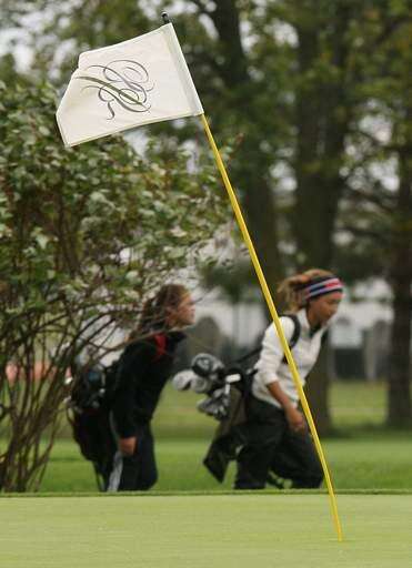 Golfers playing in the DuPage Valley Conference golf match Monday in St. Charles battled brutal winds during their round. The flagstick on the 13th green provided a good indicator of the fierce winds in the Fox Valley. Carolyn Wong, left of Naperville Central and Elisa Palluau of Naperville North were part of the first group to tee off Monday.