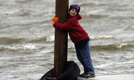 Danny Burke,8, of Schaumburg dons winter gloves and a hat as he visits Busse Lake with his dad and brother on Monday.