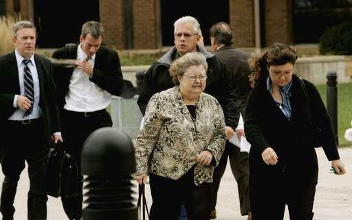 Attorney Terry Chiganos of Lisle walks into the wind Monday as he leaves the DuPage County courthouse in Wheaton.
