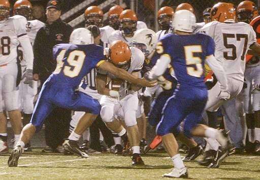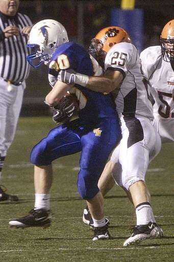 WEEK 6- Steven Kmiotek of Wheaton Warrenville South tackles Ben Murrow of Wheaton North during the Friday's game at Wheaton North High School.