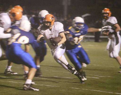 WEEK 6- Wheaton Warrenville South's running back, Matthew Rogers, pushes past Wheaton North defense into the end zone for a touchdown during the first half of Friday's game at Wheaton North High School.