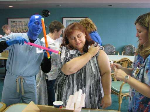 So hospitals are promoting prevention. At Advocate Lutheran General Hospital in Park Ridge, employees formed the Flu Man Group, a takeoff on the Blue Man Group, with three men in blue paint traveling through hospital floors doing skits to promote flu shots, accompanied by a flu cart to get them done immediately.