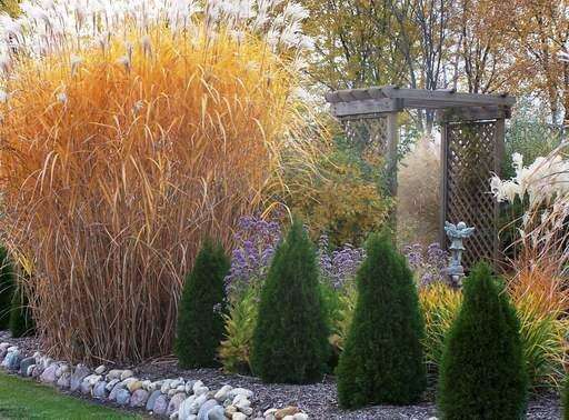 Ornamental grasses also work well. The tallest by far, and the grass that hides my neighbor's driveway, is Giant Chinese Silver Grass (Miscanthus floridulus). Layers of robust, bamboo-like foliage blush with purple in the fall. It quickly grows to 10 feet tall. I swear if I stood still long enough, I would be able to see it grow.