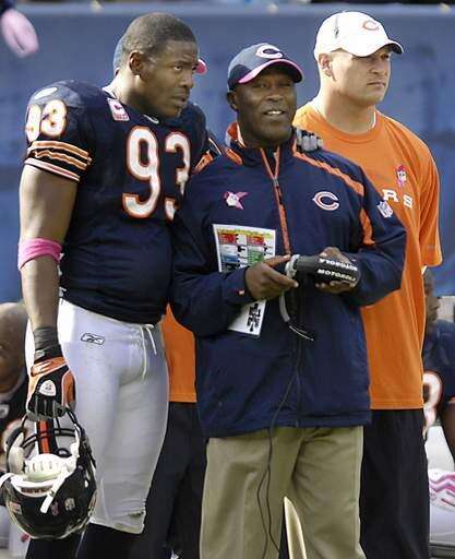 JChicago Bears defensive lineman Adewale Ogunleye brings a smile to coach Lovie Smith near the end of the Detroit Lions game Sunday at Soldier Field. John Starks | Staff Photographer