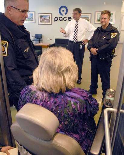 Des Plaines resident Sharon Lamp is told by Pace general consul Thomas Ciecko, in white shirt, that she and other physically challenged people cannot wait in the lobby of the Pace Headquarters in Arlington Heights because of the fire code. Bill Zars | Staff Photographer
