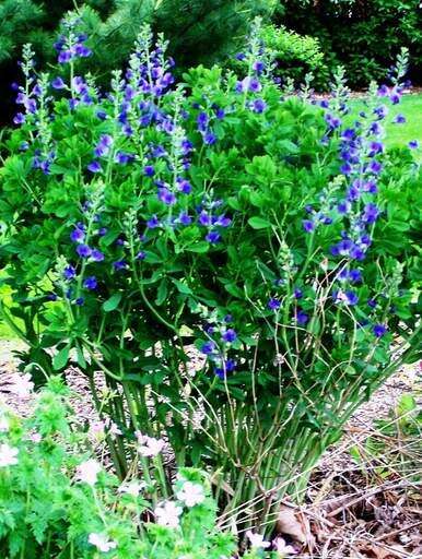 Another sun-lover, false blue indigo (Baptisia australis), boasts four seasons of interest. Purple flower spikes bloom in spring; pretty blue green, clover-like foliage cover the 3- to 4-foot shrublike perennial in summer; seedpods turn black and rattle with fall and winter winds.