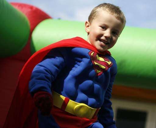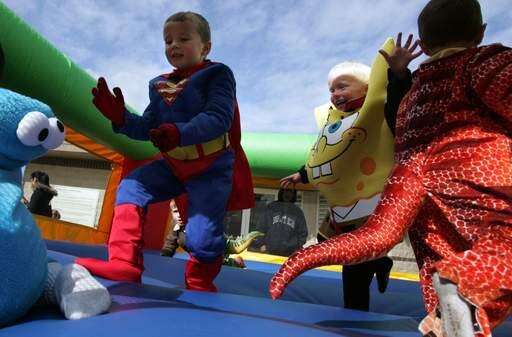 Logan Sticklen, 5, in superman costume left, and Ryan Duggan, 4, in Sponge Bob costume, both of Vernon Hills play in an air filled play pin at Vernon Hills Park District's Trucks, Trunks & Treats on Saturday . George LeClaire | Staff Photographer