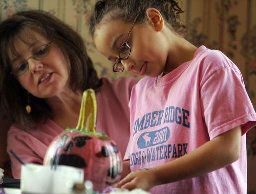 Hannah Mille, 8, and her mom Donna, both of Hoffman Estates paint a pumpkin during the annual pumpkin festival Saturday at Sunderlage Farmhouse in Hoffman Estates. Brian Hill | Staff Photographer
