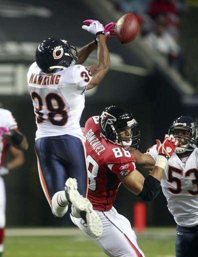 DeCoud's first pick stymied the Bears' first red-zone trip. After his second pick, the Falcons needed just three plays to tie the score at 7-7 with 9:03 left in the second quarter. Roddy White caught a short pass from Ryan then streaked untouched into the end zone as two Bears defensive backs were blocked out of the play.