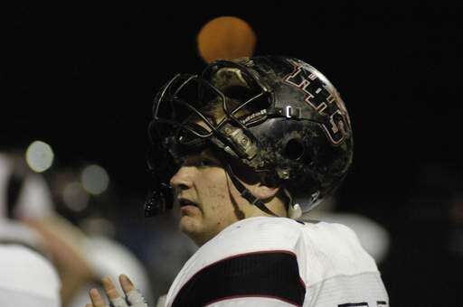 PLAYOFFS - ROUND 1: Huntley's Timothy Lycos fakes a pass to Marcus Popenfoose during the first half of playoff game on Friday, October 30.