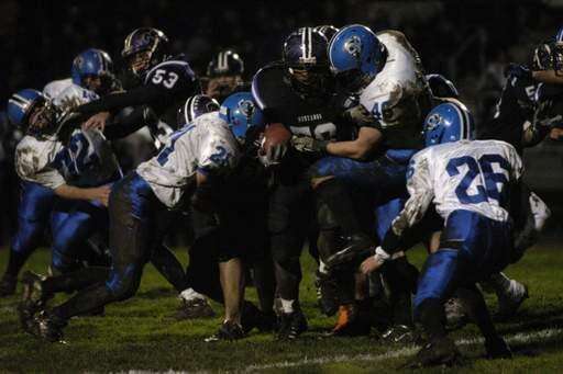 PLAYOFFS - ROUND 1: Erick Louis-Charles of Rolling Meadows loses a fumble near the goal line in the first half against Lake Zurich but Rolling Meadows recovered.