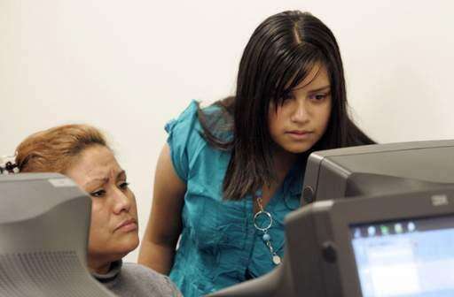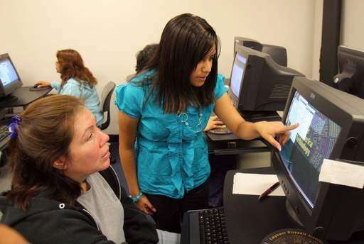 Karina Cazares, 14, helps Ninfa Bonilla, both of Waukegan, during a computer class at SER-Jobs for Progress in Mundelein. Cazares is a high school student at St. Martin de Porres in Waukegan and volunteers her time.
