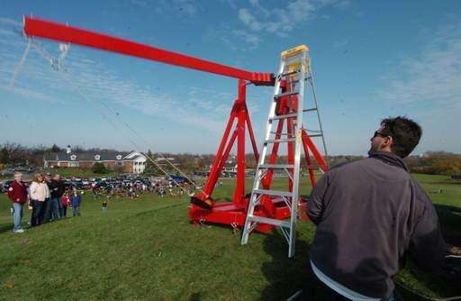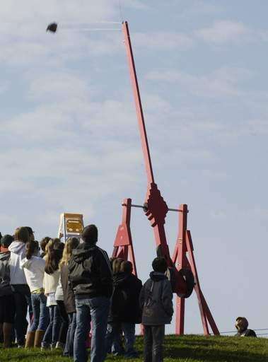 A pumpkin is launched with a catapult during the Mundelein Park and Recreation District's Pumpkin Drop Sunday at the Mundelein Community Center.