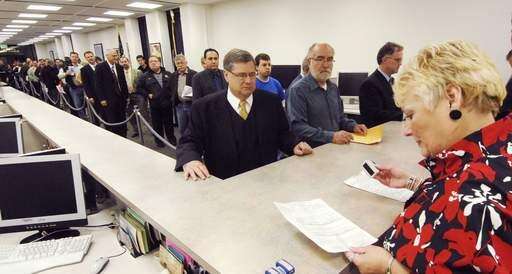 DuPage County Sheriff John Zaruba, center, was first in line to file petitions for the February elections at the board of elections in Wheaton Monday.