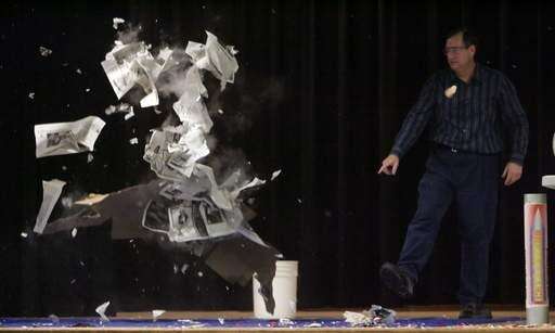Jerry Zimmerman, aka Mr. Freeze of Fermilab talks to the science students Thursday at Larson Middle School in Elgin. Here he blows up a box using a sealed bottle with liquid nitrogen in it.
