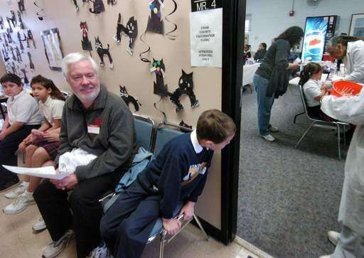 6-year-old Nate Carlson waits nervously with his dad Greg for his H1N1 flu vaccination at St. Thomas Villanova School in Palatine.