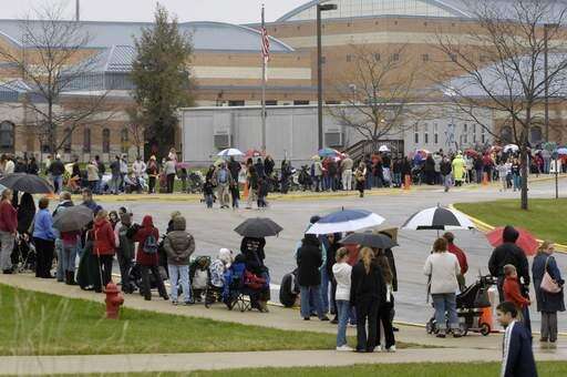 The line winds all the way around St. Charles North High School Monday during the first administration of the H1N1 vaccine in Kane County. 4,000 units were available in both nasal spray and injection form.